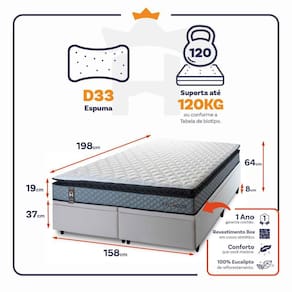- Altura: 19 cm (colchão) + 37 cm (box baú) + 8 cm (pés) = 64 cm de altura;