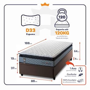 Medidas Colchão + Box: 88x188x64 cm, 96X203x64 cm, 138x188x64 cm, 158x198x64 cm, 193x203x64 cm.