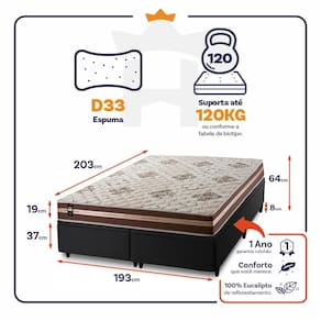 - Altura: 19 cm (colchão) + 37 cm (box baú) + 8 cm (pés) = 64 cm de altura;