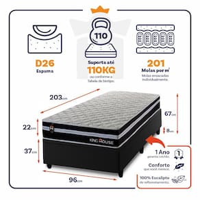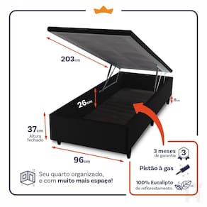 - Altura: 22 cm (colchão) + 37 cm (box baú) + 8 cm (pés) = 67 cm de altura;