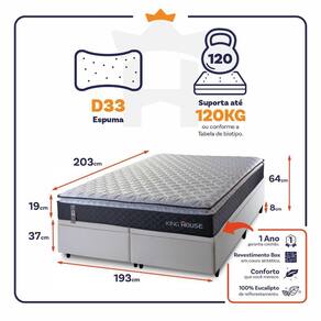 O Colchão Dakota é feito com os mais nobres materiais em sua composição, ele conta com espuma D33. Por ser mais macio, o colchão traz benefícios e ajuda no alinhamento da coluna. O colchão King House acomoda melhor o contorno do corpo, dispondo de forma correta quadris e ombros, expulsando as dores e problemas de coluna.