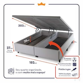 - Altura: 19 cm (colchão) + 37 cm (box baú) + 8 cm (pés) = 64 cm de altura;