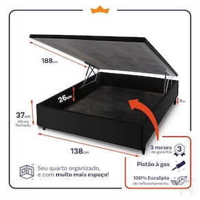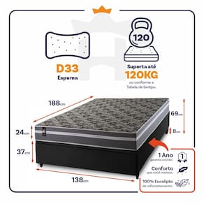 - Altura: 24 cm (colchão) + 37 cm (box baú) + 8 cm (pés) = 69 cm de altura;