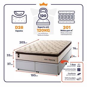 O Colchão Quartzo é feito com os mais nobres materiais em sua composição, ele conta com espuma D28 e molas ensacadas. Por ser mais macio, o colchão de molas ensacadas individualmente traz benefícios e ajuda no alinhamento da coluna. O colchão King House acomoda melhor o contorno do corpo, dispondo de forma correta quadris e ombros, expulsando as dores e problemas de coluna.