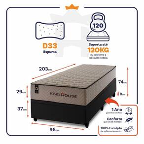 - Altura: 29 cm (colchão) + 37 cm (box baú) + 8 cm (pés) = 74 cm de altura;
