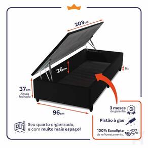 - Altura: 29 cm (colchão) + 37 cm (box baú) + 8 cm (pés) = 74 cm de altura;