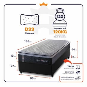 - Altura: 19 cm (colchão) + 37 cm (box baú) + 8 cm (pés) = 64 cm de altura;