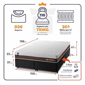 O Colchão Venice é feito com os mais nobres materiais em sua composição, ele conta com espuma D26 e molas ensacadas. Por ser mais macio, o colchão de molas ensacadas individualmente traz benefícios e ajuda no alinhamento da coluna. O colchão King House acomoda melhor o contorno do corpo, dispondo de forma correta quadris e ombros, expulsando as dores e problemas de coluna.