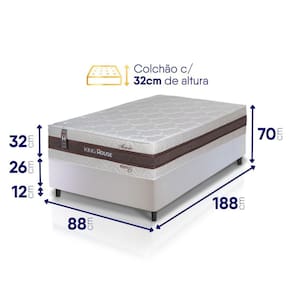 - Altura: 58 cm (colchão) + 12 cm (box) = 70 cm de altura;