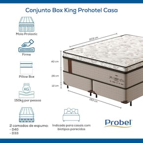 Com alto padrão de qualidade, a combinação das duas mantas de espumas, sendo uma com densidade D33 e a outra com densidade D40, o Conjunto Box King Prohotel Casa traz a sustentação firme.