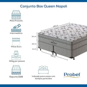 Conjunto Box Queen ; de Molas Prolastic Napoli da ProbelDescubra o conforto e a qualidade que oferece excelente relação custo-benefício. Ideal para quem busca um Conjunto Box com firmeza intermediária, durável e acessível, o Napoli combina tecnologia avançada e materiais de alta qualidade para proporcionar noites de sono reparadoras e saudáveis.