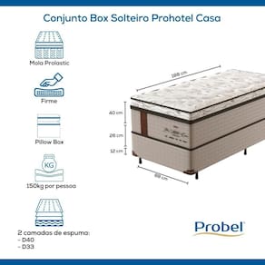 Com alto padrão de qualidade, a combinação das duas mantas de espumas, sendo uma com densidade D33 e a outra com densidade D40, o Conjunto Box Solteiro Prohotel Casa traz a sustentação firme.