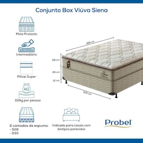 As espumas do Conjunto Box Viúva Siena foram desenvolvidas com a Tecnologia ProMax Probel, que passam por rigorosos testes de qualidade em laboratório e recebem tratamento antiácaro e antifungo.