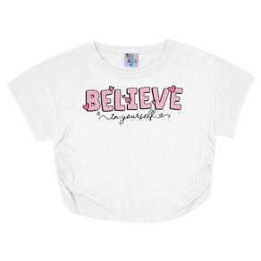 Para passeios com ao shopping, parque ou visitar a vovó nada como estar confortável, segura e fashion. O conjunto believe contém uma blusa confeccionada em meia malha na cor branca com a frase estampada “Believe in yourself” (acredite em si mesma) e detalhes de glitter na estampa, um verdadeiro charme para a peça. O short saia que acompanha o conjunto, é confeccionado em jeans na cor índigo médio. As peças podem ser usadas separadamente, aumentando a versatilidade do uso!