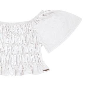 Prontas para um passeio especial? Preparamos o conjunto fashion para as meninas, a blusa no modelo cropped é confeccionada em meia malha na cor branca e possuí placa de metal com identificação Pulla Bulla próximo da cintura. Já o short saia jeans na cor índigo escuro possuí pregas e botão frontal. As peças podem ser usadas separadamente, aumentando assim sua versatilidade.