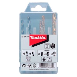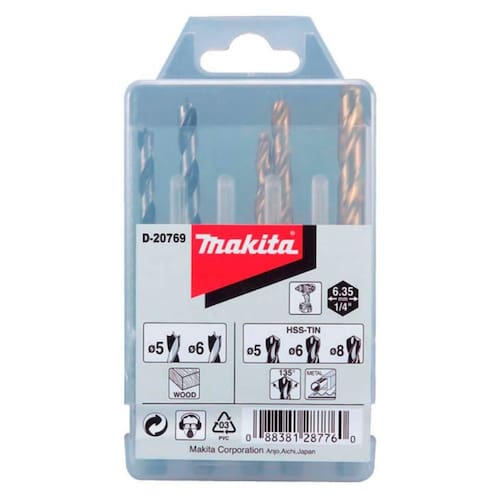 - Marca: Makita; - Referência: D-20769; - Broca para metal de 5, 6 e 8mm; - Broca para madeira de 5 e 6mm; - Encaixe sextavado de 1/4''; - Garantia: 3 meses.