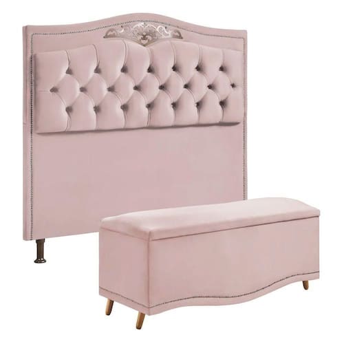 Conjunto Cabeceira E Calçadeira Holanda 140cm Veludo Rosê Star Confort Rose O conjunto de cabeceira e calcadeira Holanda possui um lindo design retro, essa linha e para quem busca renovar a decoracao do quarto, sem deixar de lado o conforto e a praticidade. Sao resistentes e confeccionadas com materiais de alta qualidade, suas medidas sao indicadas para cama box de 1,38 cm. Combine a cabeceira com travesseiros e almofadas de sua preferencia e torne sua decoracao ainda mais charmosa e aconchegante. A calcadeira pode ser usada para sentar e para guardar objetos, pois ela funciona como um bau.