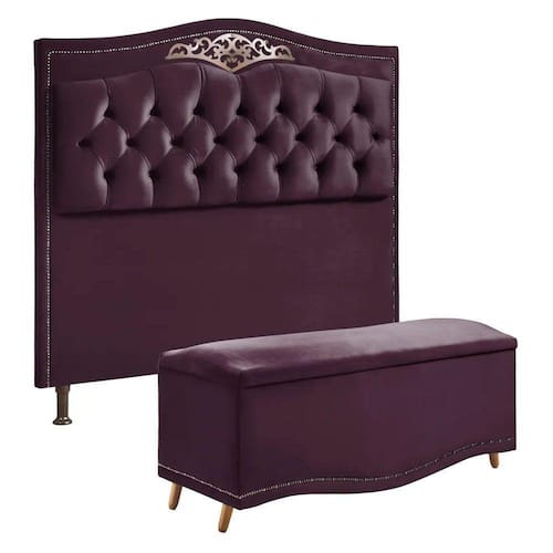 Conjunto Cabeceira E Calçadeira Holanda 90cm Veludo Speciale Home Roxo O conjunto de cabeceira e calcadeira Holanda possui um lindo design retro, essa linha e para quem busca renovar a decoracao do quarto, sem deixar de lado o conforto e a praticidade. Sao resistentes e confeccionadas com materiais de alta qualidade, suas medidas sao indicadas para cama box de 1,38 cm. Combine a cabeceira com travesseiros e almofadas de sua preferencia e torne sua decoracao ainda mais charmosa e aconchegante. A calcadeira pode ser usada para sentar e para guardar objetos, pois ela funciona como um bau.
