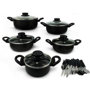 O Conjunto de 5 Panelas Caçarola é uma ótima escolha para quem quer equipar sua cozinha com produtos modernos e de boa qualidade, as panelas foram desenvolvida com alças térmicas e todo o conjunto é antiaderente para não deixar que os alimentos grudem no fundo das panelas, deixando tudo mais saboroso, além de ficar muito mais fácil na hora de lavar. Ótima para o preparo dos alimentos e com um fogão de cinco bocas, tudo pode ser preparado em sincronia. Possui tampas de vidro para você olhar o cozimento de seus alimentos com mais praticidade e rapidez, além de acompanhar 24 talheres
