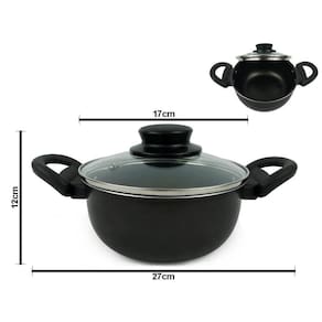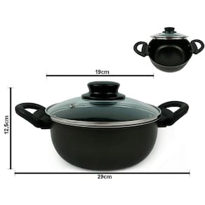 - Marca: Dona Chefa - Material: Alumínio teflon antiaderente - Material das tampas: Vidro temperado - Material Alças e Poméis: Baquelite - Cor: Preto - Formato: Circular - Revestimento: 5 camadas antiaderente - Possui tampa com saída de vapor: Sim - Pode ir a máquina de lavar louça: Sim - Pode ir ao micro-ondas: Não