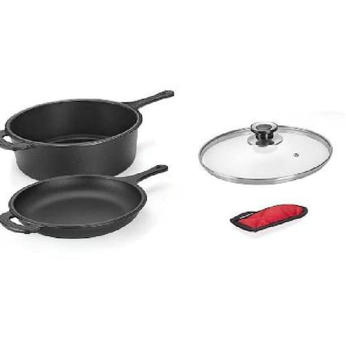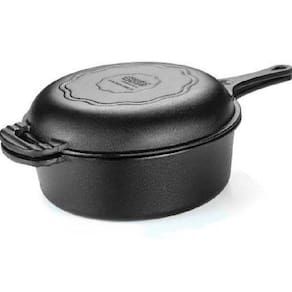 Descrição Do Produto:Conjunto Caçarola e Frigideira Multiuso de Ferro Fundido + Tampa de Vidro 26CM 2 produtos em 1 só, na parte de baixo uma caçarola com 26cm de diâmetro x 12,5cm de altura para preparar os mais variados alimentos, sua tampa de ferro é também uma frigideira, toda em ferro com 26cm de diâmetro x 4,5cm de altura. Pode ser utilizado como assadeira podendo ir direto ao forno para preparar pães, bolos e etc. Ideal para Arroz, bife, carnes, frango, feijão, caldos e etc. A caçarola é uma panela que apresenta uma grande versatilidade, pois tem o fundo plano e maior área de contato com a fonte de calor, cozinhando os alimentos uniformemente. Com a frigideira prepare carnes suculentas, peixes, ovos, omeletes, panquecas e todos os tipos de alimentos Pode ser utilizada em vários tipos de fogão a gás e também a lenha. Maior durabilidade, condução e conservação de calor.Especificações do produto:Material: Ferro fundido. Fabricante: Panela Mineira.Dimensões:Caçarola: 26cm de diâmetro x 12,5cm de altura. Frigideira(tampa): 26cm de Diâmetro x 4,5cm de altura. Peso: 5,1kg.Itens Inclusos:01 Caçarola 26cm; 01 Tampa de Ferro (Modelo Frigideira); 01 Tampa de Vidro 26cm (Serve tanto na caçarola como na Frigideira); 01 Pegador Térmico Ean: 7897396645662