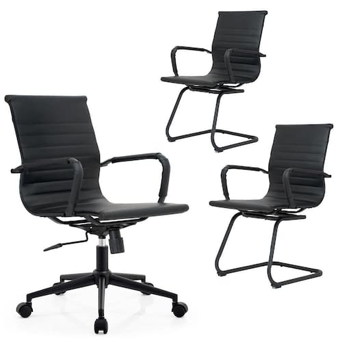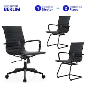 Conjunto Cadeiras de Escritório Moob Berlim 1 Cadeira Diretor e 2 Cadeiras Executivas Base Fixa Esteirinha All Black