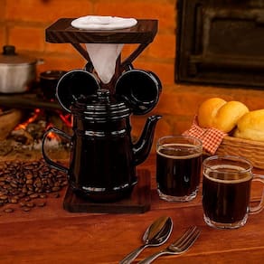 Conjunto café com bule de alumínio e suporte rústico - black Conjunto para café artesanal - suporte em madeira com coador de pano, bule em alumínio e 2 canecas em acrílico Transforme seu cantinho do café em um espaço cheio de charme e aconchego, trazendo para sua casa o charme de uma cafeteria. Este conjunto artesanal reúne um suporte em madeira rústica, cafeteira em alumínio com design retrô, coador de pano removível e duas canecas em acrílico, unindo funcionalidade e estilo para momentos únicos. Perfeito para decorar sua cozinha, varanda ou sacada, é o convite ideal para celebrar pausas gostosas - seja o coffee break relaxante, o café da manhã em família ou aquela tarde com amigos. Cada peça foi pensada para trazer conforto e uma experiência acolhedora. Presenteie-se ou surpreenda quem você gosta com um item que combina tradição, qualidade e afeto. Porque café não é só bebida, é momento para compartilhar, celebrar e apreciar com estilo e carinho. Dimensões aproximadas: - suporte coador de café em madeira: altura: 22 cm x largura: 12 cm x comprimento: 12 cm - bule de café em alumínio de 450 ml: altura: 11 cm x largura: 7 cm x comprimento: 7 cm Características do produto: - suporte artesanal em madeira com acabamento rústico decorativo, coador de pano removível para café, bule em alumínio e duas canecas em acrílico. Um conjunto funcional, feito com cuidado e bom gosto para valorizar e organizar seu cantinho do café. Cuidados e sugestões: - limpe o suporte de madeira com pano seco ou levemente umedecido. Lave o coador de pano apenas com água e deixe secar bem. Use o lado amarelo da esponja para limpar o bule de alumínio e as canecas acrílicas, evitando riscos. Guarde em local arejado e seco. do produto: - o produto é cuidadosamente embalado para evitar danos durante o transporte. Caso ocorra algum problema, oferecemos um sistema de e troca para sua tranquilidade. Imagens meramente ilustrativas - produto artesanal, podendo variar de cor e/ou tonalidade