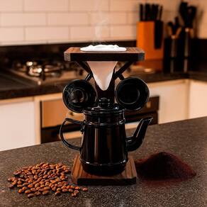Conjunto café com bule de alumínio e suporte rústico - black Conjunto para café artesanal - suporte em madeira com coador de pano, bule em alumínio e 2 canecas em acrílico Transforme seu cantinho do café em um espaço cheio de charme e aconchego, trazendo para sua casa o charme de uma cafeteria. Este conjunto artesanal reúne um suporte em madeira rústica, cafeteira em alumínio com design retrô, coador de pano removível e duas canecas em acrílico, unindo funcionalidade e estilo para momentos únicos. Perfeito para decorar sua cozinha, varanda ou sacada, é o convite ideal para celebrar pausas gostosas - seja o coffee break relaxante, o café da manhã em família ou aquela tarde com amigos. Cada peça foi pensada para trazer conforto e uma experiência acolhedora. Presenteie-se ou surpreenda quem você gosta com um item que combina tradição, qualidade e afeto. Porque café não é só bebida, é momento para compartilhar, celebrar e apreciar com estilo e carinho. Dimensões aproximadas: - suporte coador de café em madeira: altura: 22 cm x largura: 12 cm x comprimento: 12 cm - bule de café em alumínio de 450 ml: altura: 11 cm x largura: 7 cm x comprimento: 7 cm Características do produto: - suporte artesanal em madeira com acabamento rústico decorativo, coador de pano removível para café, bule em alumínio e duas canecas em acrílico. Um conjunto funcional, feito com cuidado e bom gosto para valorizar e organizar seu cantinho do café. Cuidados e sugestões: - limpe o suporte de madeira com pano seco ou levemente umedecido. Lave o coador de pano apenas com água e deixe secar bem. Use o lado amarelo da esponja para limpar o bule de alumínio e as canecas acrílicas, evitando riscos. Guarde em local arejado e seco. do produto: - o produto é cuidadosamente embalado para evitar danos durante o transporte. Caso ocorra algum problema, oferecemos um sistema de e troca para sua tranquilidade. Imagens meramente ilustrativas - produto artesanal, podendo variar de cor e/ou tonalidade