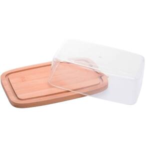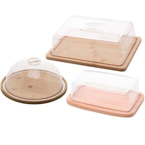 Conjunto Café da Manhã Prato Porta Queijo Redondo, Queijeira Retangular e Manteigueira de Bambu com Tampa Plástica Lyor