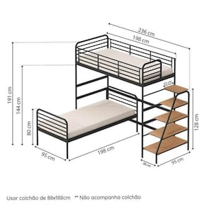 A Cama Alta com Cama Solteiro Teko oferece a combinação ideal entre design moderno, resistência e versatilidade. Com estrutura metálica de alta resistência e acabamento industrial com toque retrô, garante segurança, durabilidade e muito estilo para o ambiente. Cama Alta conta com uma escada lateral multifuncional, que também funciona como estante decorativa e organizadora. Na parte inferior, a cama de solteiro com cabeceiras em tubos metálicos arredondados proporciona charme atemporal e conforto para o dia a dia.Com estrado em MDF, capacidade de até 80 kg por cama e certificação de segurança, essa solução é perfeita para quartos compactos ou projetos que exigem funcionalidade sem abrir mão do design, com a linha Teko conquiste um ambiente prático, moderno e cheio de personalidade. Produto Montado: Sim Acompanha Colchão: Não Altura do Conjunto: 191 cm Ambiente Principal: Quarto Infantil codigo_ean: 7900288147998 Complexidade da Montagem: Média: pode ser montado por mais de uma pessoa e/ou necessite de maior conhecimento para montagem Cor: Preto Fosco / Álamo Cor do Produto: Preto Fosco / Álamo Escala de Brilho: Semi-Fosco Extensível: Não Informação Complementar: 1x Cama Alta Infantil/juvenil Teko Preto Fosco / Álamo Largura: 236 cm Altura: 191 cm Peso: 78 kg Profundidade: 95 cm Necessita Montagem: Sim