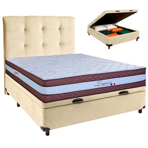 Conjunto Cama Box Bau Blindado Casal + Colchão Molas Ensacadas Legaccy Paropas + Cabeceira - Nature | Off White | Gengibre