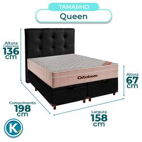Conjunto Queen Colchão Airtech + Cama Box BauColchão Ortobom Queen com 25cm de altura, ideal para conforto no uso diárioTecido em poliéster que garante toque suave e boa ventilaçãoSuporte de até 120kg, ideal para diferentes biotipos com firmeza balanceadaBase baú Queen com 42cm de altura e amplo espaço interno para organizaçãoRevestimento em Material Sintético resistente, fácil de limpar e com visual modernoEstrutura reforçada com capacidade para até 150KgFicha Técnica Colchão:Modelo: AirtechMarca: OrtobomTamanho: QueenTecido: PoliésterLargura: 158cmComprimento: 198cmAltura: 25cmSuporte de Peso: 120KgGarantia: 3 MesesFicha Técnica Cama Box Bau:Modelo: EliteMarca: NatureTamanho: QueenTecido: Material Sintético Largura: 158cmComprimento: 198cmAltura: 35cmAltura dos Pés: 7cmMaterial dos Pés: MadeiraSuporte de Peso: 150KgPeso: 40KgGarantia: 3 MesesAtenção:Antes da compra certifique-se de que o produto passa por elevadores, portas e corredores.As transportadoras não realizam entregas por escadas ou içamentos.Caso o item não caiba no elevador, a entrega será considerada concluída no térreo do prédio.A cor e tonalidade do produto pode variar de acordo com o dispositivo que o usuário está acessando.
