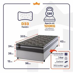 - Altura: 24 cm (colchão) + 26 cm (box) + 12 cm (pés) = 62 cm de altura;