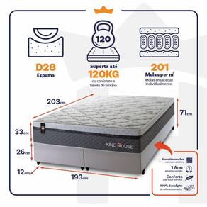 - Altura: 33 cm (colchão) + 26 cm (box) + 12 cm (pés) = 71 cm de altura;