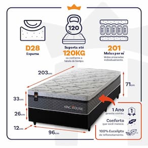 - Altura: 33 cm (colchão) + 26 cm (box) + 12 cm (pés) = 71 cm de altura;
