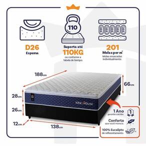 - Altura: 28 cm (colchão) + 26 cm (box) + 12 cm (pés) = 66 cm de altura;