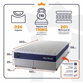 - Altura: 28 cm (colchão) + 26 cm (box) + 12 cm (pés) = 66 cm de altura;