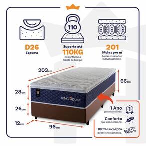 - Altura: 28 cm (colchão) + 26 cm (box) + 12 cm (pés) = 66 cm de altura;