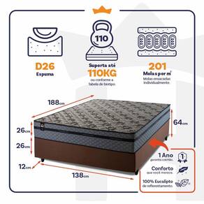 - Altura: 26 cm (colchão) + 26 cm (box) + 12 cm (pés) = 64 cm de altura;