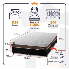 - Altura: 22 cm (colchão) + 26 cm (box) + 12 cm (pés) = 60 cm de altura;