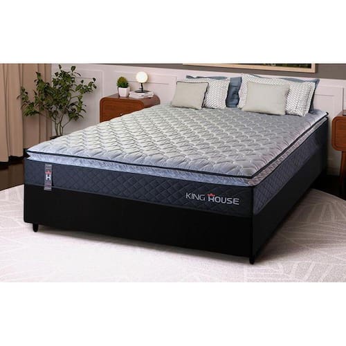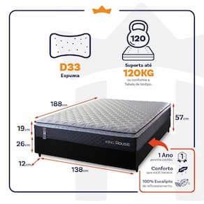 Feito com os mais nobres materiais em sua composição, ele conta com espuma D33 . O colchão King House acomoda melhor o contorno do corpo, dispondo de forma correta quadris e ombros, expulsando as dores e problemas de coluna.