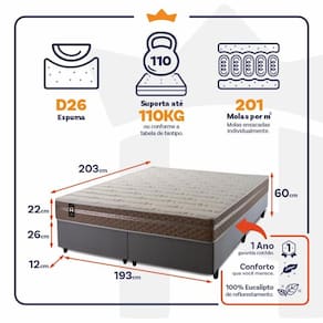- Altura: 22 cm (colchão) + 26 cm (box) + 12 cm (pés) = 60 cm de altura;