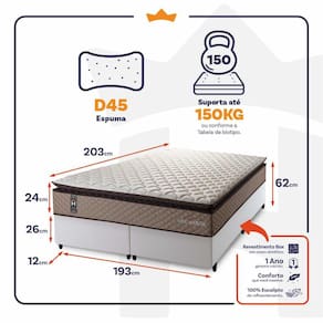 - Altura: 24 cm (colchão) + 26 cm (box) + 12 cm (pés) = 62 cm de altura;