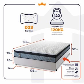 Feito com os mais nobres materiais em sua composição, ele conta com espuma D33 . O colchão King House acomoda melhor o contorno do corpo, dispondo de forma correta quadris e ombros, expulsando as dores e problemas de coluna.