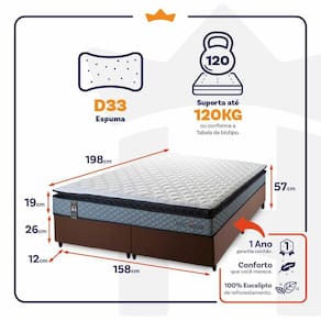 - Altura: 19 cm (colchão) + 26 cm (box) + 12 cm (pés) = 57 cm de altura;