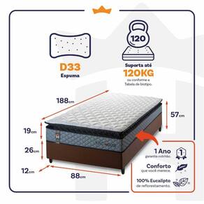 - Altura: 19 cm (colchão) + 26 cm (box) + 12 cm (pés) = 57 cm de altura;