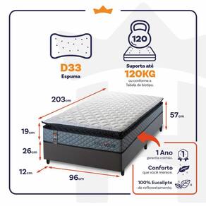 - Altura: 19 cm (colchão) + 26 cm (box) + 12 cm (pés) = 57 cm de altura;