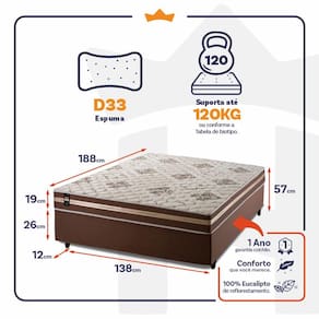 - Altura: 19 cm (colchão) + 26 cm (box) + 12 cm (pés) = 57 cm de altura;