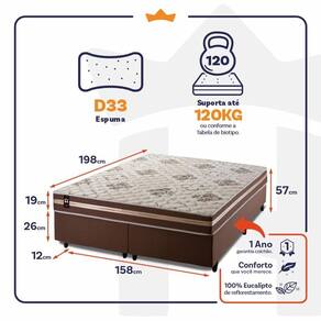 - Altura: 19 cm (colchão) + 26 cm (box) + 12 cm (pés) = 57 cm de altura;