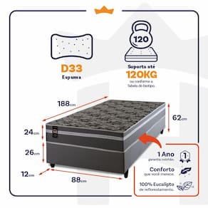 - Altura: 24 cm (colchão) + 26 cm (box) + 12 cm (pés) = 62 cm de altura;